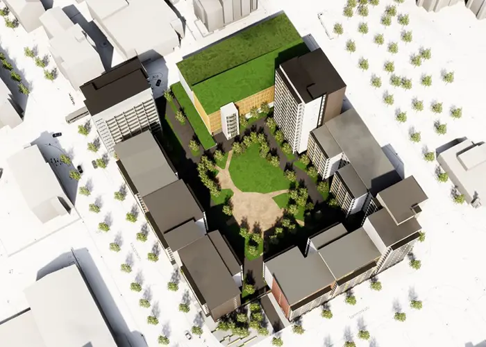 Luonnoskuva Lahden Paavolan uudesta korttelikokonaisuudesta ilmastapäin katsottuna Luonnoskuva uudesta korttelikokonaisuudesta ilmastapäin katsottuna