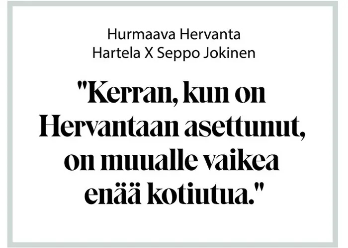 – Se, että muutin täältä pois. Ajaessani äsken valtaväylää ylös, tajusin kuinka hyvä Hervantaan on tulla, ja senkin, että jos on joskus Hervannassa asunut, muualle on vaikea enää asettua. Muistat varmaan kuinka nopeasti me tänne kotiuduimme.