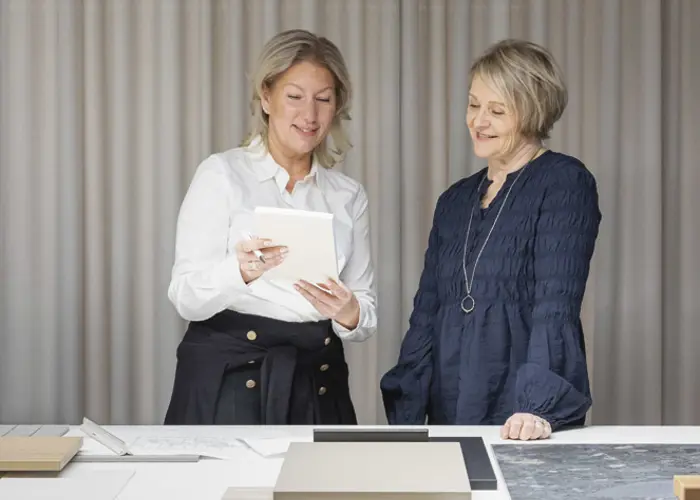 Ensimmäinen tapaaminen Hartelan sisustuskoordinaattorin kanssa toi suunnittelun konkreettiselle tasolle. Kohtaaminen oli Maijun ja Jounin mukaan mutkaton ja avoin. Tulevan kodin vaihtoehtoja tarkasteltiin yhdessä ja ratkaisuja pohdittiin eri näkökulmista.