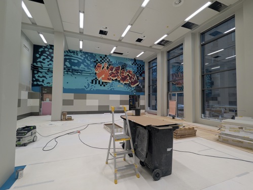 Monitoimisalin pintamateriaaliasennukset ja pukuhuoneiden alakattotyöt