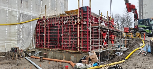 Työmaalla käynnissä rungon elementtiasennus ja itäpäädyn KVV-liittymät.