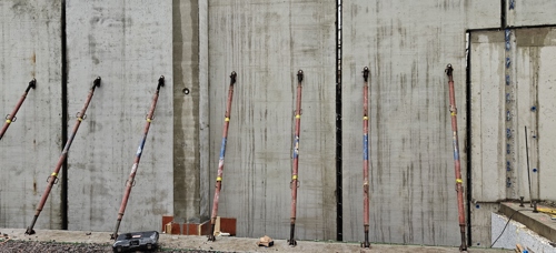 Maanpaineseinän elementtejä tuettuna väliaikaisin tuin.