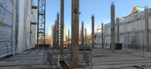 Työmaalla käynnissä rungon elementtiasennus ja itäpäädyn KVV-liittymät.