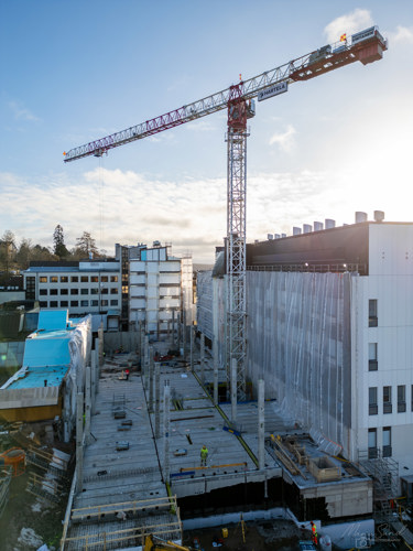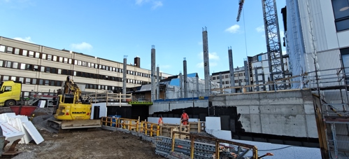 Työmaalla käynnissä julkisivun eristystyöt, IV-kattokonehuoneen rungon asennus, väliseinämuuraus, pintalattioiden valutyöt sekä työmaa-aikaisen hissin asennus.