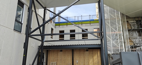 Työmaalla käynnissä julkisivun eristystyöt, IV-konehuoneen seinäelementtien asennus, väliseinämuuraus, pintalattioiden valutyöt, katon kallistusvalujen valmistelu ja tekniikan roilotukset tiiliväliseiniin.