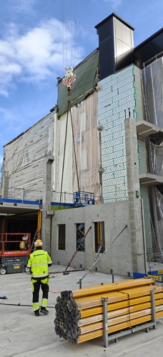 Työmaalla käynnissä rungon elementtiasennus ja itäpäädyn KVV-liittymät.