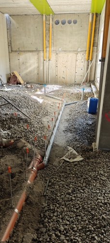 Työmaalla käynnissä julkisivun eristystyöt, IV-konehuoneen kattotyöt, väliseinämuuraus, pintalattioiden valutyöt, höyrysulkuasennus, viemäriputkiasennus, lattialämmitysputkien asennus ja tekniikan uritukset tiiliväliseiniin.