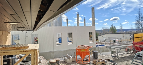Työmaalla käynnissä rungon elementtiasennus, väliseinämuuraus, pintalattiavalujen valmistelu, sekä itäpäädyn KVV-asennus.