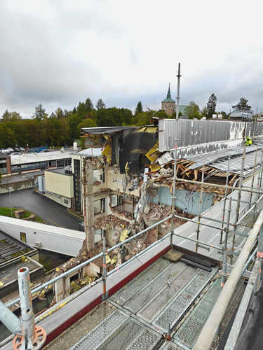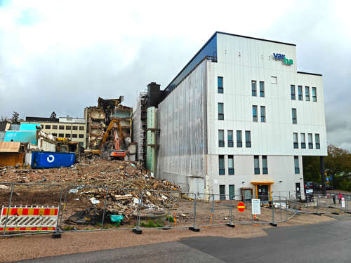 AK-lohkon rungon purku käynnissä. Sairaalan pääsisäänkäynnin ympäristöä varattu purkutyöalueeksi.