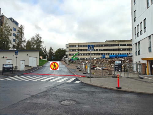 - Työ- ja henkilöturvallisuutta varten muistutus, että F-lohkon ja Sähkömuuntajan välisellä ajoradalla jalankulku sekä pyöräilyliikenne on kielletty.