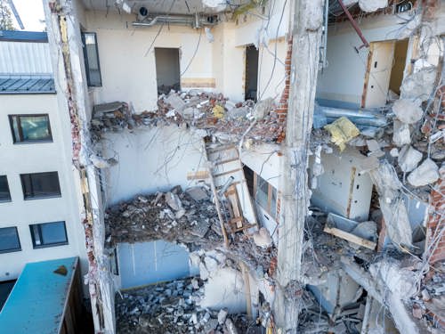 AK-lohkon rungon purku käynnissä. Sairaalan pääsisäänkäynnin ympäristöä varattu purkutyöalueeksi.