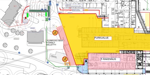 - Työ- ja henkilöturvallisuutta varten muistutus, että F-lohkon ja Sähkömuuntajan välisellä ajoradalla jalankulku sekä pyöräilyliikenne on kielletty.